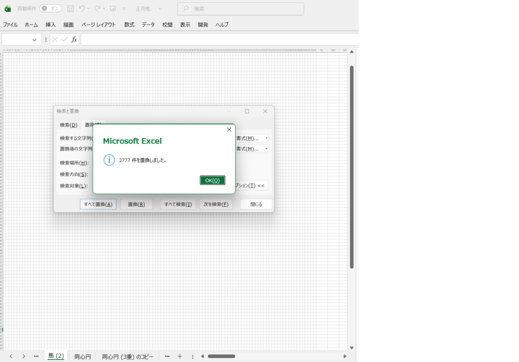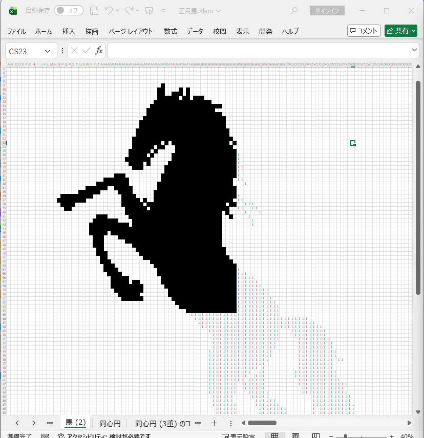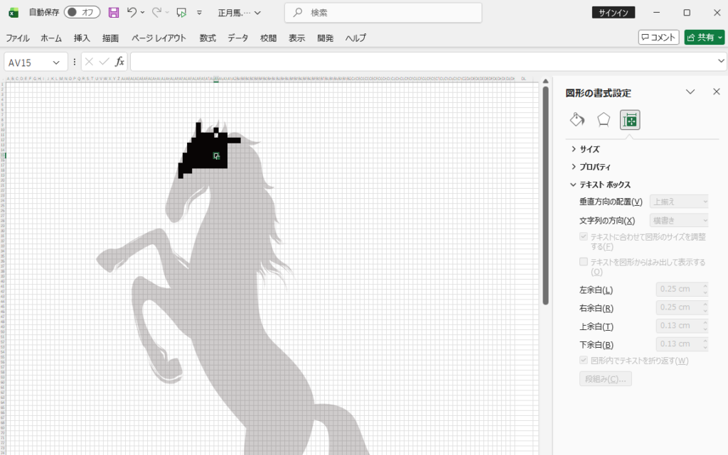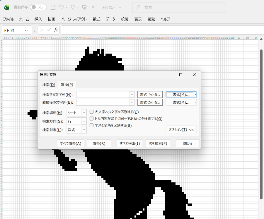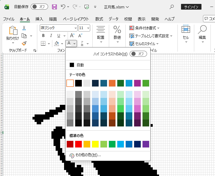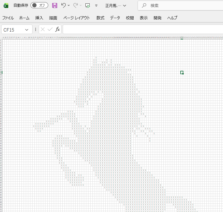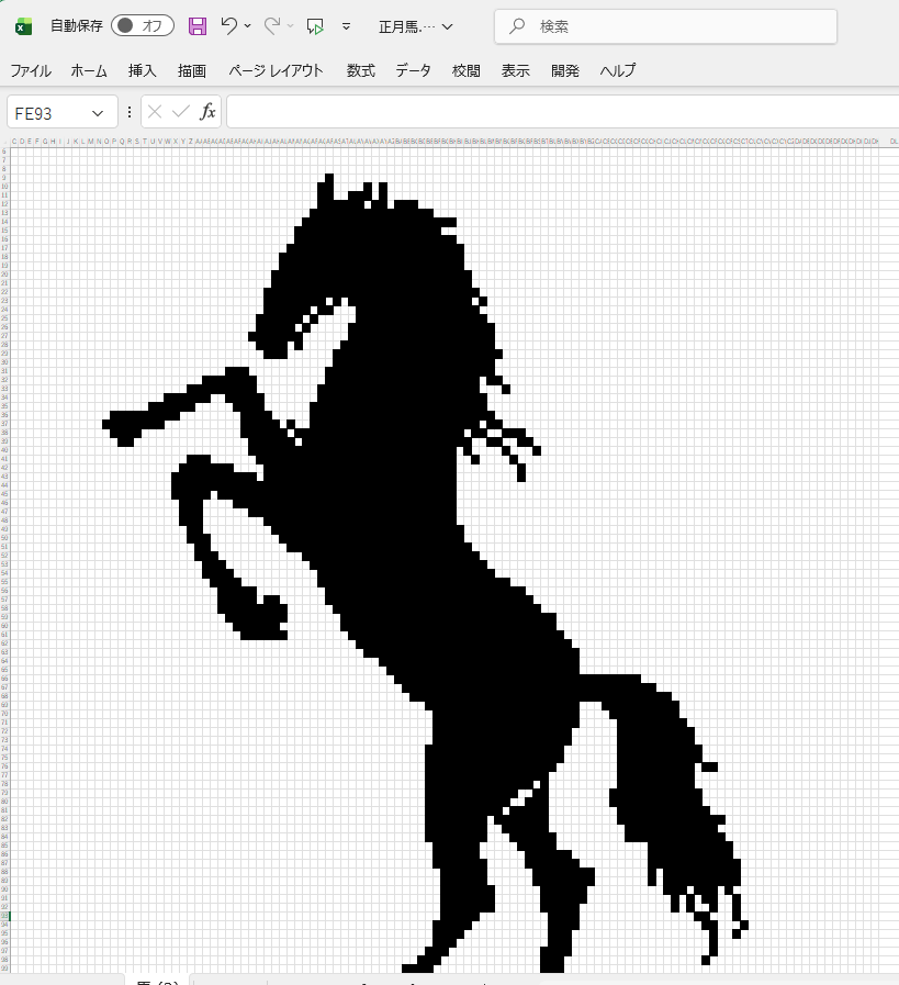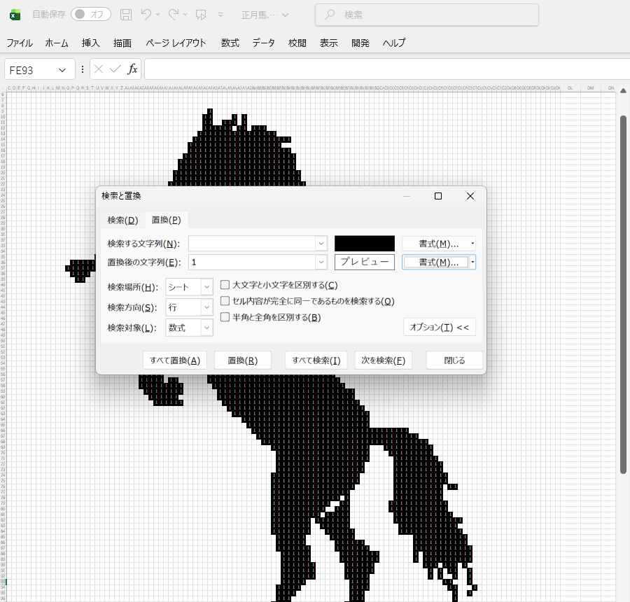 絵が仕上がったところで、いよいよVBAマクロでこの絵を浮き出す、というプログラム作りに入りたいところですが、その前に、より制御しやすくするために、黒く塗りつぶしたセルが、それとわかるように、セル内に数字を入れるようにしておきます。