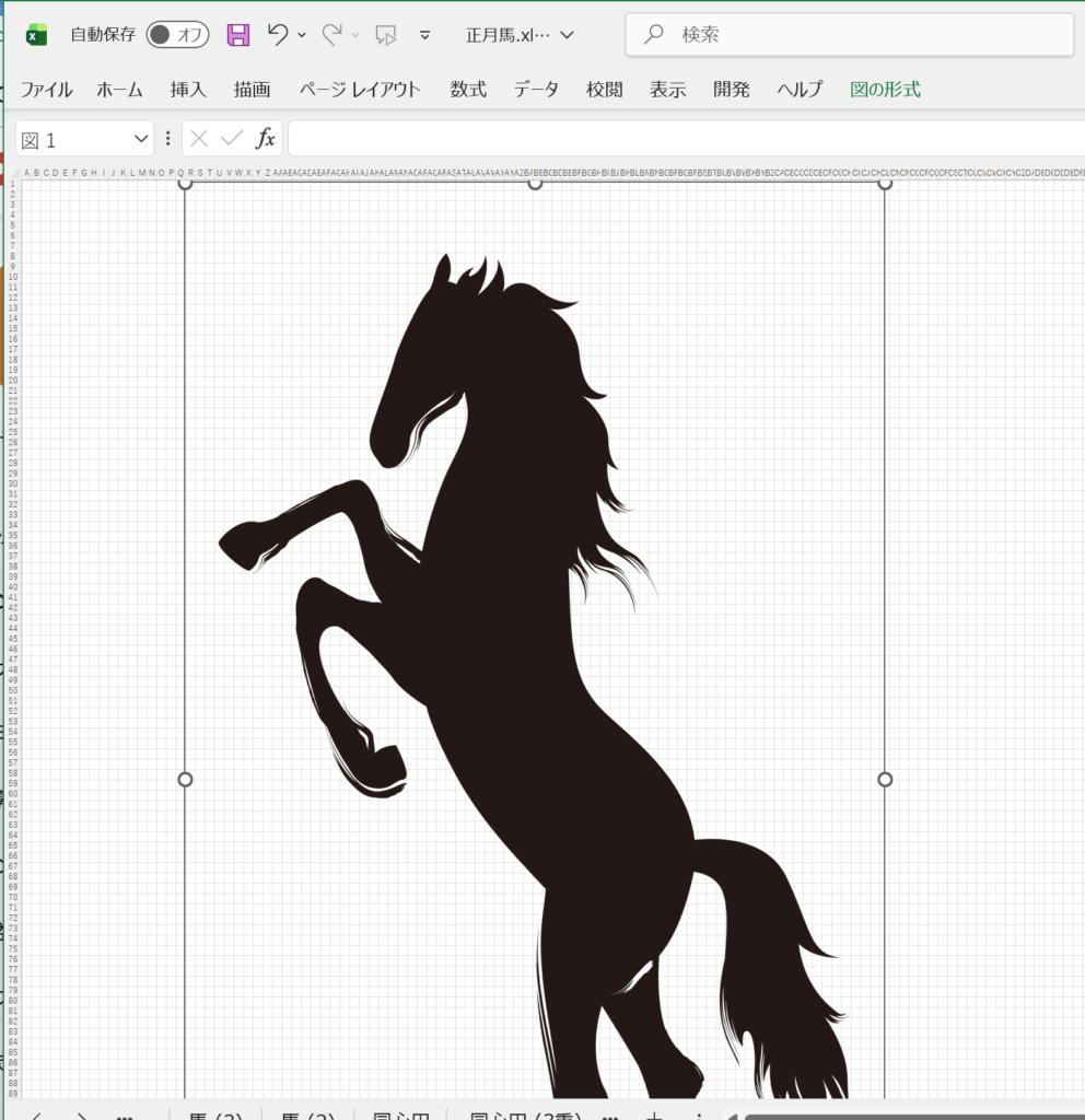 これができましたら、用意した絵をエクセルに移していきます。絵を横にして、Excelマス目を自分で塗っていくのでもいいのですが、絵の創作自体にはあまり興味がない人は次ような方法を使ってみてください。