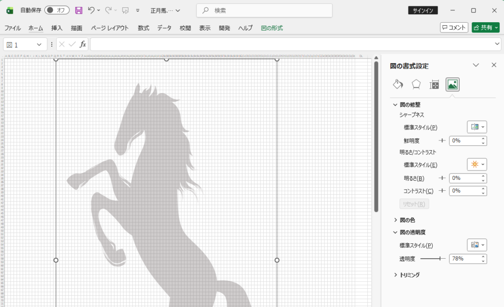 Excelドット絵でも似た感じでこの技法が使えます。絵に沿ってセルに色を付けて(塗っていく)いけばよいのです。ただ貼り付けた絵がExcelシートより上になっている状態なので、そのままだと作業が大変やりにくい。そこで、貼り付けた絵を次のように細工してみます。