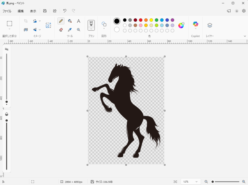 この絵はPNG形式になっているので、馬の周りは格子状になっています。今回のドット絵の場合は、他の形式でも大丈夫です。絵が開けましたら、メニューから「コピー」を選んで、絵全体をクリップボードにコピーしておきます。