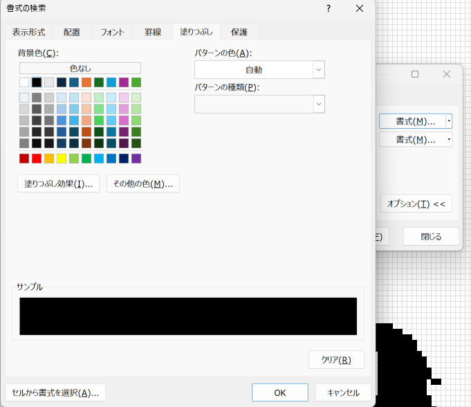 「書式の検索」画面から、「塗りつぶし」のタグを選び、背景色で、絵を塗りつぶした色を指定します。この絵の場合は「黒」を選びました。