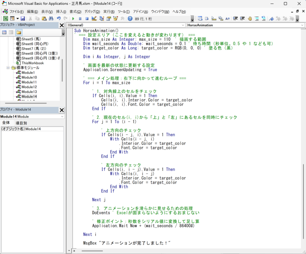 このプログラムは、シート上のセルを左上から右下に向けて1つずつチェックし、数字の「1」を見つけると、その場所を黒く塗りつぶしていく仕組みになっています。なお、動画の最後にある題字の表示についてはこのコードでは割愛しています。