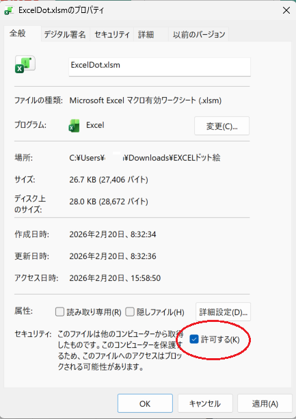 ファイルのプロパティ画面から下の赤で示したチェックボックスを許可して、OKボタンをクリックすれば続けることができるようになります。もちろん、念のため、事前にウィルススキャンはしてください。