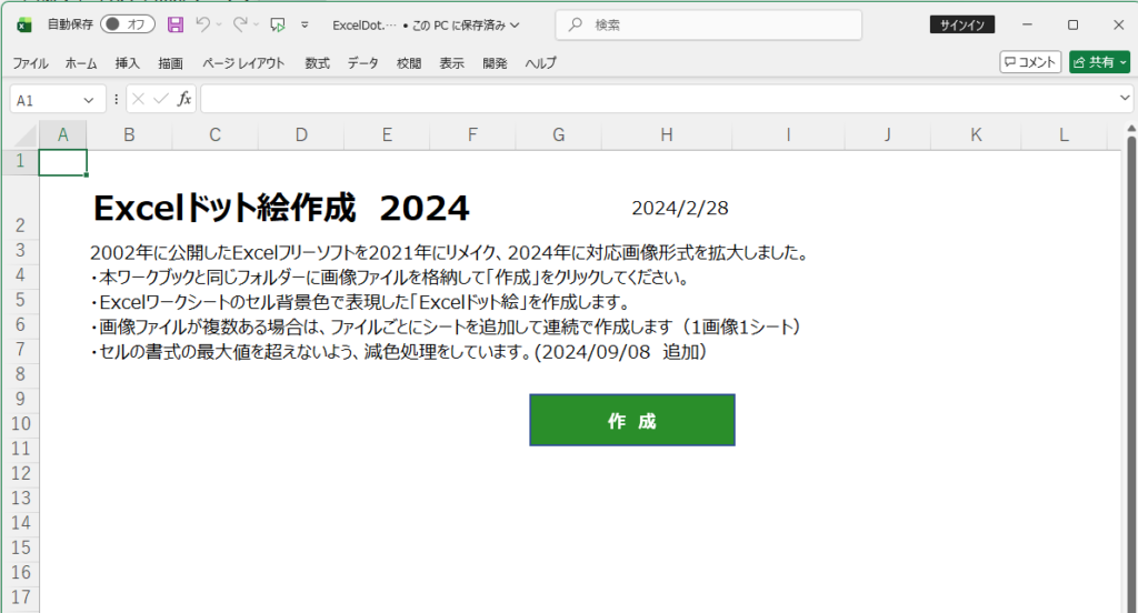 「Excelドット絵2024」起動画面