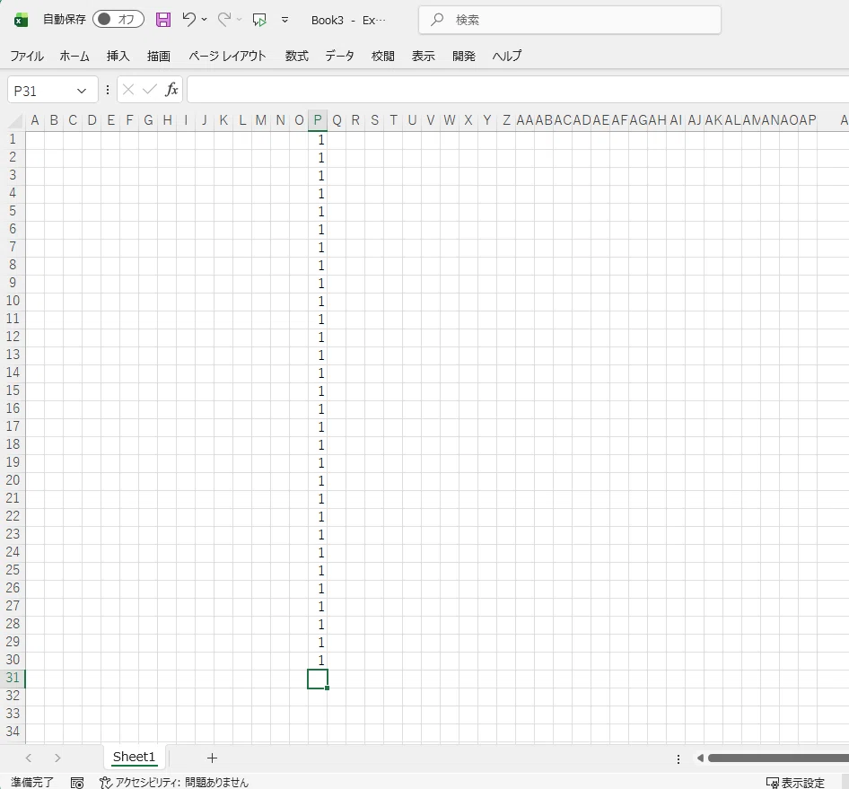 3.画面の列の真ん中あたり(ここではP列)、に数字の1を入れていきましょう。下では30行まで入れてみました。
