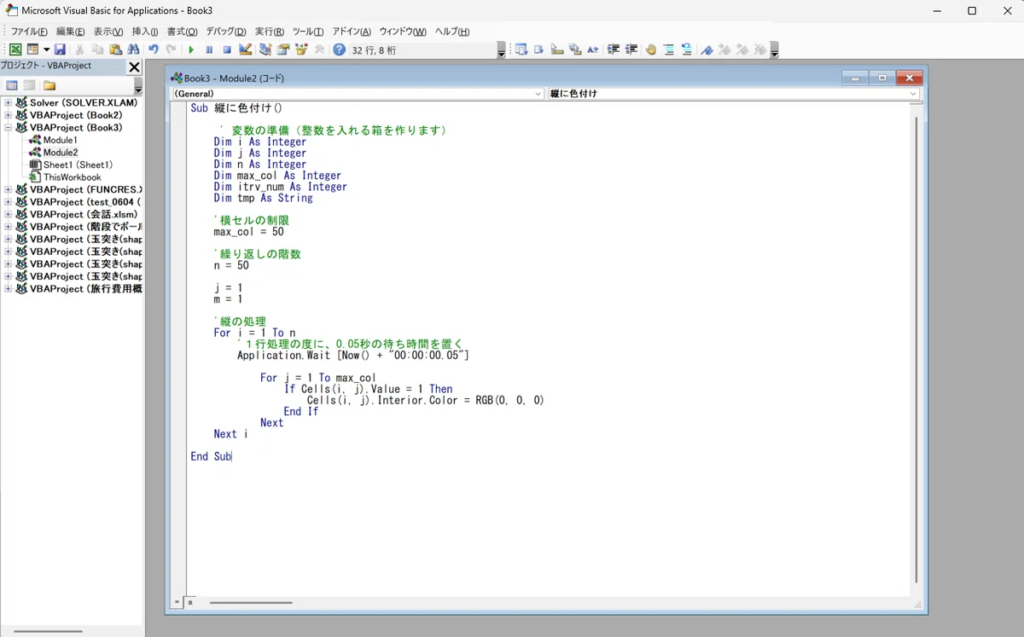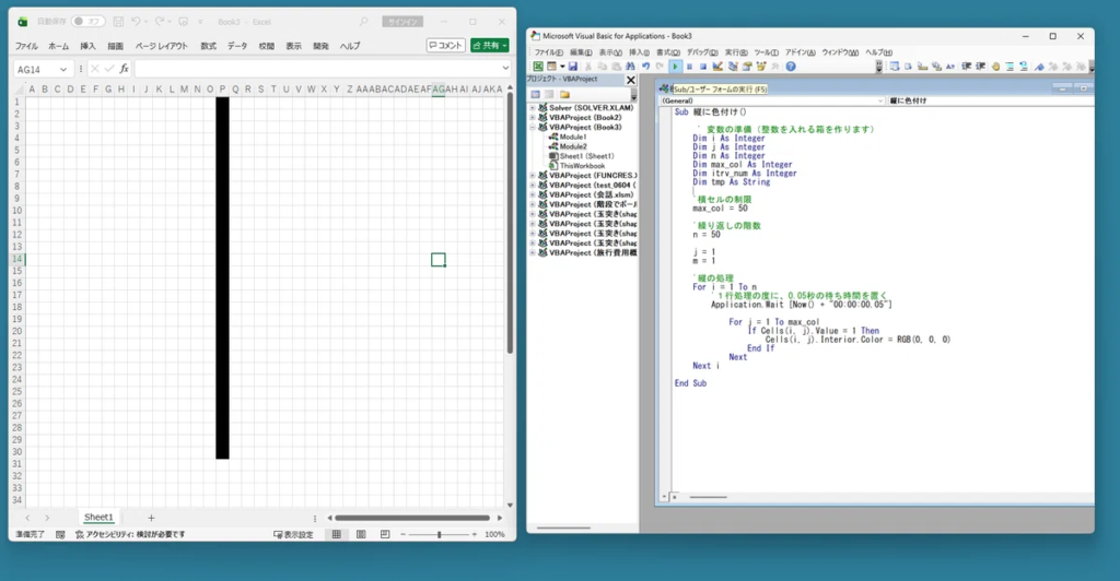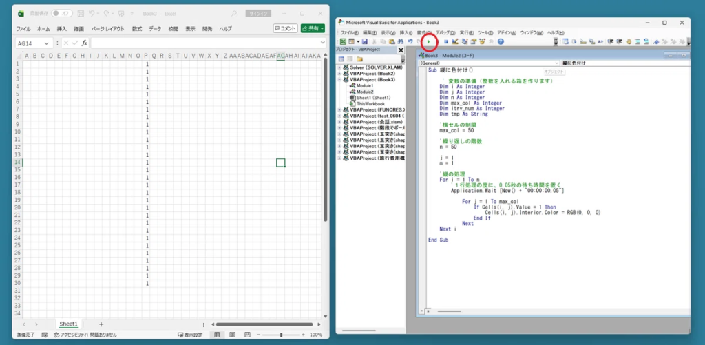このプログラムは、シート上のセルを上から1つずつチェックし、数字の「1」を見つけると、その場所を黒く塗りつぶしていく仕組みになっています。