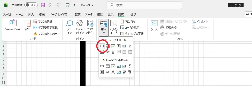 - [挿入] をクリックし、一番左上の [ボタン(フォームコントロール)] を選びます。