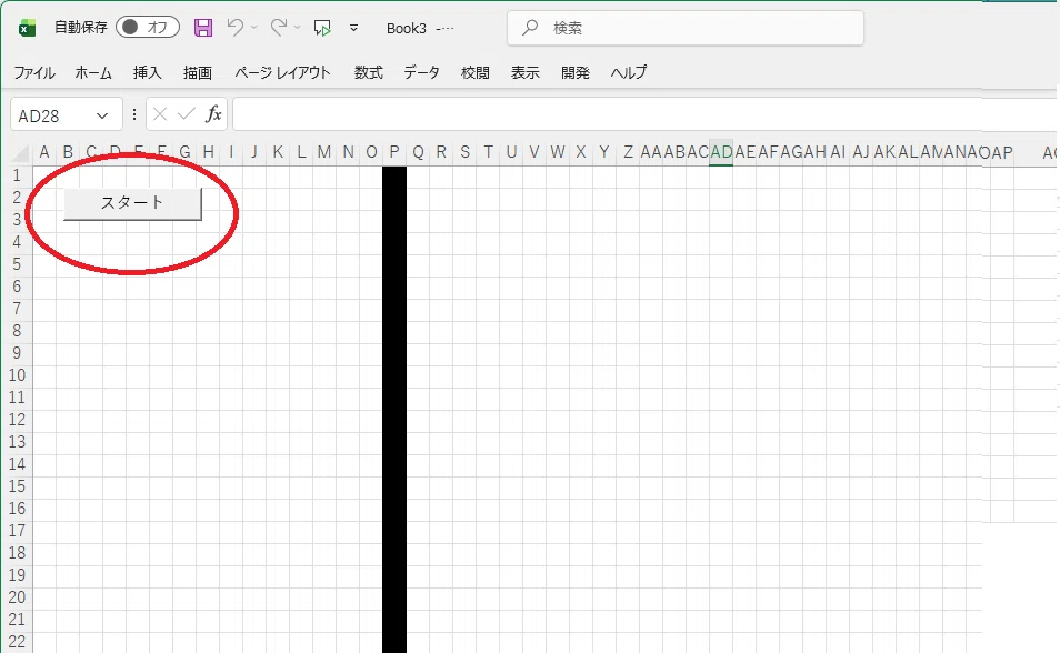 - シート上の好きな場所で、マウスをドラッグして四角いボタンを配置します。ボタンの名前も「スタート!」などに変えておきましょう。右クリックすると簡単に移動できますよ。