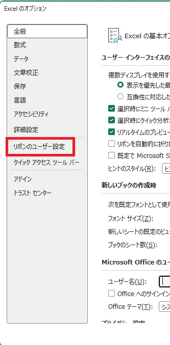 3.左側のメニューから [リボンのユーザー設定] を選びます。