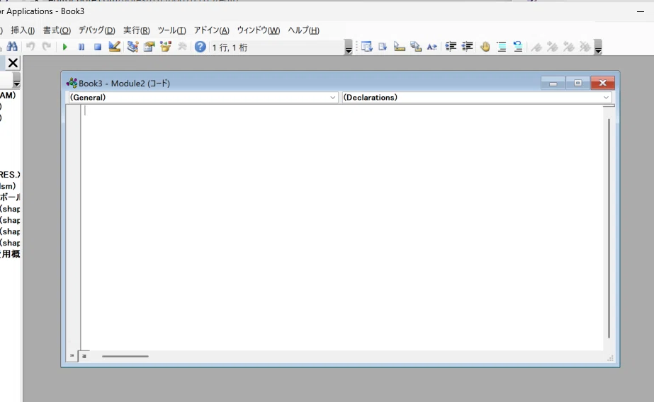 - VBE(エディタ)の画面を表示します。横に、Excelの画面を並べておくとわかりやすいです。