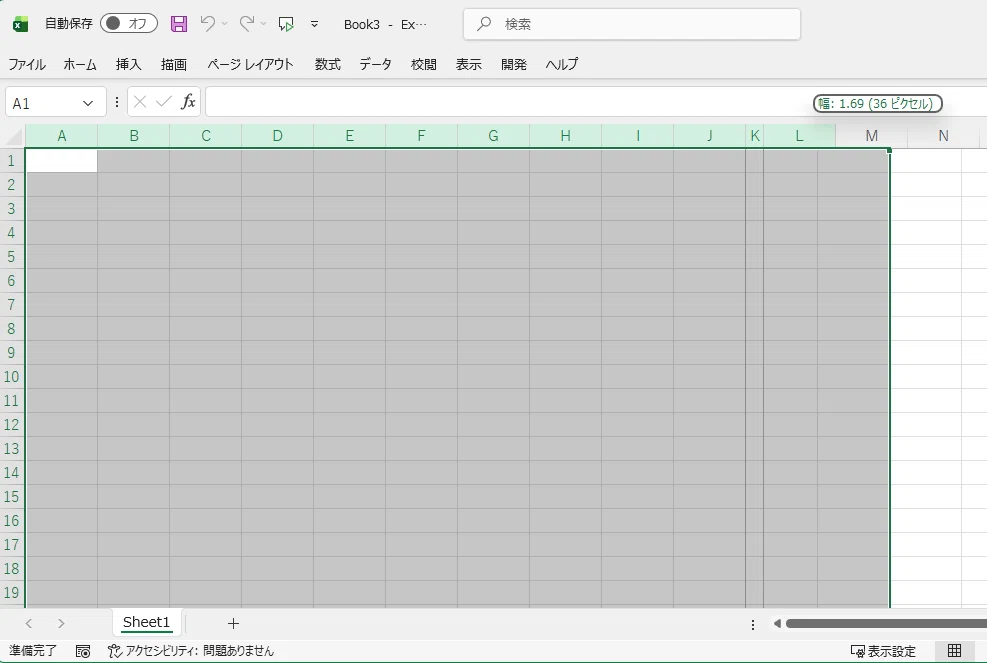 1.Excelシートを正方形のセルに整えます。行、列それぞれ50くらいあればよいです。列だったら下図のようにA、B、C・・と上のカラムをドラッグして複数の列を選んでおき、その後、どれか1つを縮めるようにすれば一気に同じ幅にすることができます。(他にも方法はあります)