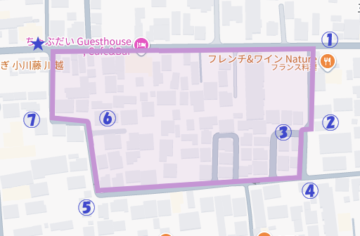 川越 七曲り の場所は少しわかりにくいのですが、川越市立中央図書館や川越郵便局の道のひとつ南側を通る中央公民館に向かった道がその一部になっています。永島家住宅(旧武家屋敷)の脇を入りますので、ここを目指していくといいでしょう。地図だと下記の位置です。