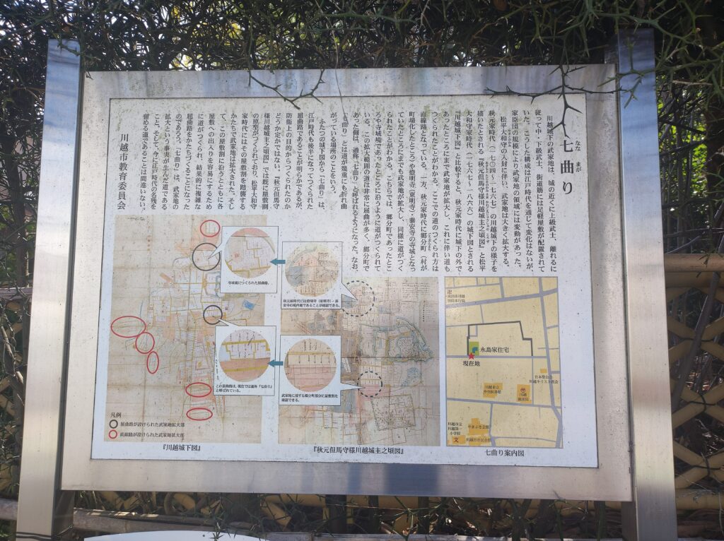 さて、「川越七曲り」に戻ります。川越の七曲りは、一本道ではないですね。ある土地一画の外周になっています。永島家住宅(旧武家屋敷)の前には次のような案内板があります。