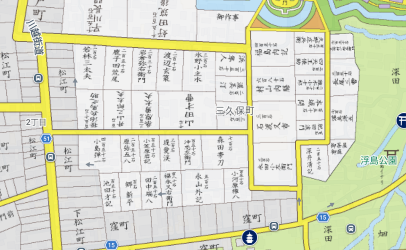当該地を古地図と照らし合わせてみます。ここも「大江戸今昔めぐり」を使ってみます。下の地図は江戸時代のものです。