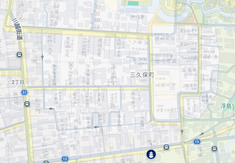 大江戸今昔めぐり」には現代地図との重ね合わせ機能があり、これを使ってみると、、
