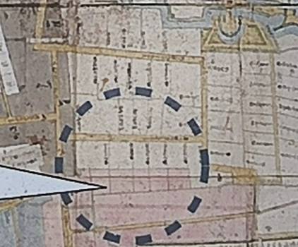 どうも、「森田帯刀」屋敷との境から南に道が作られた、というように思えます。南側の東西の道は屋敷の中盤を横切っているようにみえます。少々、画質が悪くて恐縮ですが、案内板にある同じ場所でも大きな道は同じです。