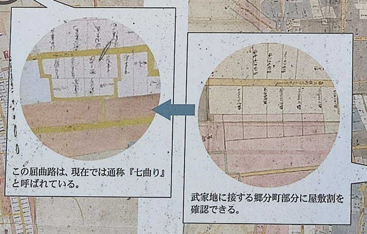 ふたつの城下図から「七曲り」は、江戸時代も後半になってつくられた屈曲路であることが明らかであるが、防衛上の目的からつくられたのかどうか定かではない。『秋元但馬守様川越城主之頃図』では既に屋敷割の原型がつくられており、松平大和守家時代にはその屋敷を踏襲するかたちでは武家地は拡大された。そして、この屋敷割に沿うとともに各屋敷への出入りを容易にするために道がつくられ、結果的に複雑な屈曲路をかたちづくることになったのであろう。「七曲り」は、武家地の拡大という事実が生んだ道であること。そして、今に江戸時代の名残を留める道であることは間違いない。