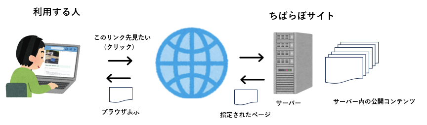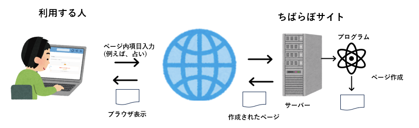 cibalaboの占いページでもこの仕組みを使っています。図で説明すると、普通にご覧いただいているページはこのように、あらかじめサーバ内に用意されているコンテンツ(ページ)を利用する人のリクエストに応じて、サーバがそのページを配信しています。